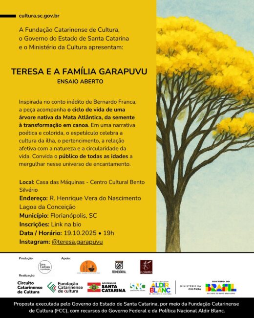 Um conto sobre raízes, pertencimento e o ciclo da vida. É assim que “Teresa e a Família Garapuvu” chega ao palco do Centro Cultural Bento Silvério (Casa das Máquinas), na Lagoa da Conceição, em Florianópolis. O espetáculo será no dia 19 de outubro (domingo), às 19h, com entrada gratuita mediante retirada de ingressos pelo Sympla através do link: bit.ly/teresagarapuvu. A classificação é livre.