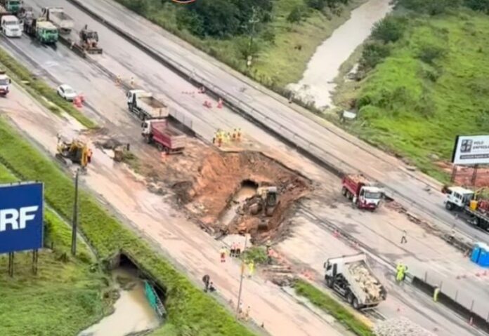 Na última quinta (16), em razão das fortes chuvas na região de Biguaçu, uma das paredes da galeria de água rompeu, causando danos na pista e, consequentemente, interdição total da rodovia no km 181 da BR-101/SC, em ambos os sentidos.