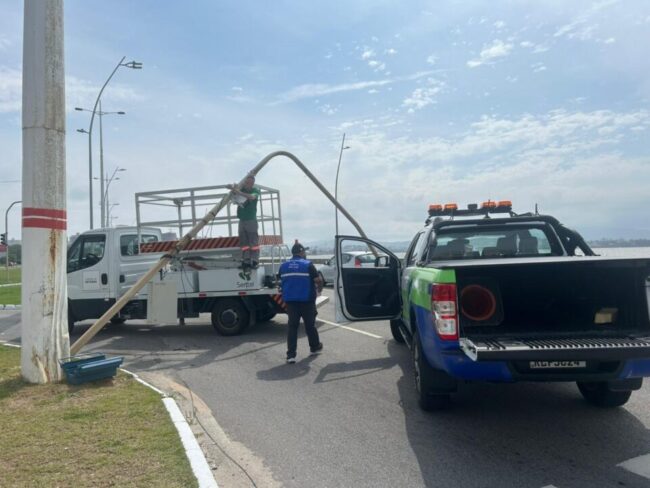O vento registrado na manhã desta terça-feira (16) provocou a queda do suporte de um semáforo na avenida Acioni Souza Filho, a Beira-Mar de São José, no cruzamento com a Rua José da Costa Vaz, próximo ao Centro de Atenção à Terceira Idade (Cati). A ocorrência mobilizou equipes de trânsito para garantir a segurança e a fluidez no local.